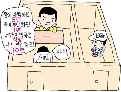 두 용의자는 서로 다른 용의자도 똑같은 제안을 받았다는 사실을 알고 있다. 그렇다면 어떤 일이 벌어질까? 그들은 먼저 이렇게 생각한다. '만일 저 친구가 이 거래를 받아들여 나를 고발하게 되면, 그는 풀려나고 나만 징역살이를 하게 된다. 이건 너무 부당한 일이야...'. 그러면서 두 용의자는 자연스레 이런 생각까지 이르게 된다. '만일 내가 먼저 고발하면 나는 풀려나게 될지도 몰라. 우리 중 하나가 풀려날 수 있는데 굳이 둘 다 벌을 받을 필요는 없지.'. 실제 그런 상황에 봉착한 실험 대상자의 대다수는 다른 상대방을 고발하는 것으로 나타났다. 하지만 그들의 공범 역시 똑같은 방식으로 생각을 하기 때문에 두 사람 다 4년의 징역형을 받게 된다. 둘 다 깊이 생각해서 침묵을 지켰더라면 2년형만 받아도 되었을텐데 말이다. 그런데 더욱 이상한 일은, 두 사람이 함께 이야기를 나눌 기회를 주고 실험을 다시 해도 똑같은 결과가 나온다는 사실이다. 공동의 대응책을 강구해 놓고서도 결국엔 서로를 배신하고 만다.