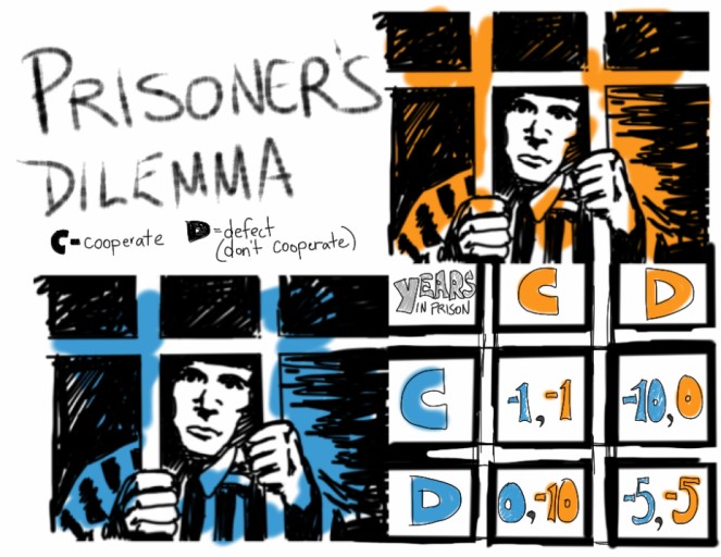 1950년 멜빈 드레셔와 메릴 플러드는 <죄수의 딜레마>라는 현상을 발견했다. 이것은 협동을 하면 모두에게 이익이 됨에도 불구하고 서로 배반을 선택하게 되는 상황을 뜻한다. 일례로, 두 용의자가 체포되어 각각의 방에 갇혔다. 조사관은 그들의 무장강도 공모사실을 자백하게 하기 위해 그들에게 한 가지 제안을 한다. 둘 중 아무도 말을 하지 않으면 각각 2년의 징역형에 처해지고, 만일 한 사람이 다른 사람을 고발했는데 다른 사람이 아무 말도 하지 않으면 고발한 사람만 풀려나고, 또 만일 두 사람이 서로 상대방을 고발하면 둘 다 징역 4년에 처한다고 하였다.